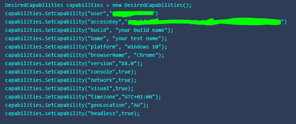 LambdaTest provide an intuitive capabilities generator, an online tool which interactively generates DesiredCapabilities code in your choice of 6 languages based on your selections in the UI. The screenshot below shows an example of C# code generated with many of the capabilities enabled.