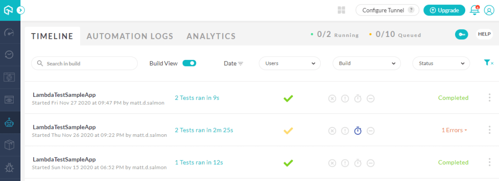Within the ‘Automate’ section, there are 3 main navigation areas. Firstly, the timeline view shows a list of test execution sessions. Note that there are filters across the top of this list to filter the results by date, user, build and status to more quickly refine the tests you want to review. You can also programmatically specify custom tags to group your Selenium tests: