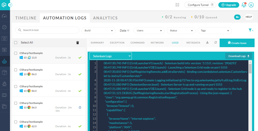 The results are grouped by build as standard, and clicking into each of these takes you across to the second navigation area, automation logs, which provides further detailed analysis of each test outcomes, including the ability to watch recordings of the tests, review network requests/responses and view test logs, if you’ve specified these capabilities in your test options. Note also that the ‘Create Issue’ button provides one-click bug logging via integration with JIRA, GitHub, Trello and other popular tracking platforms: