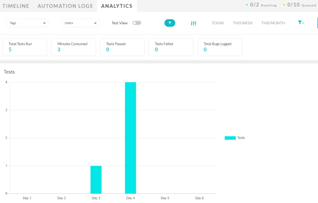 Finally the Analytics option provides metrics on your test execution and can be customised to include specific graphs and filters to specific time periods you’re interested in: