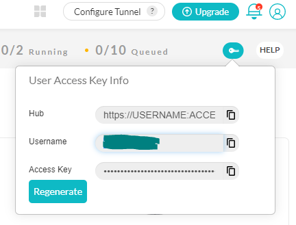 - You will need your LambdaTest credentials – username and accessKey – to see your tests’ execution. So on your LambdaTest dashboard, click on ‘Automation’ in the left navigation bar. In the top-right corner click on the key icon to retrieve your credentials, as shown in Figure 1 below.